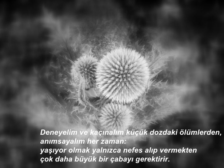Deneyelim ve kaçınalım küçük dozdaki ölümlerden, anımsayalım her zaman: yaşıyor olmak yalnızca nefes alıp vermekten çok daha büyük bir çabayı gerektirir